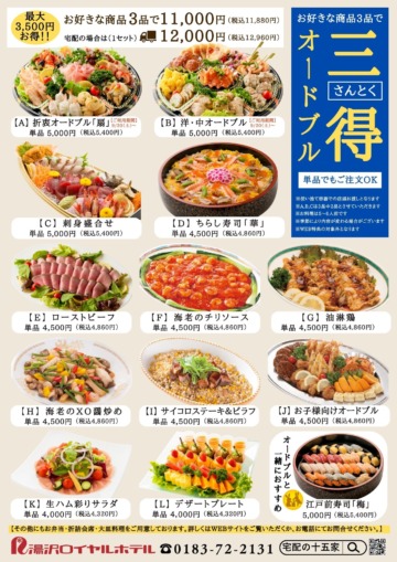 ※お選びいただいた「三得オードブル」は、お好きな商品を3品選んで12,960円(店頭お受取りは11,880円)でとってもお得なセットです。