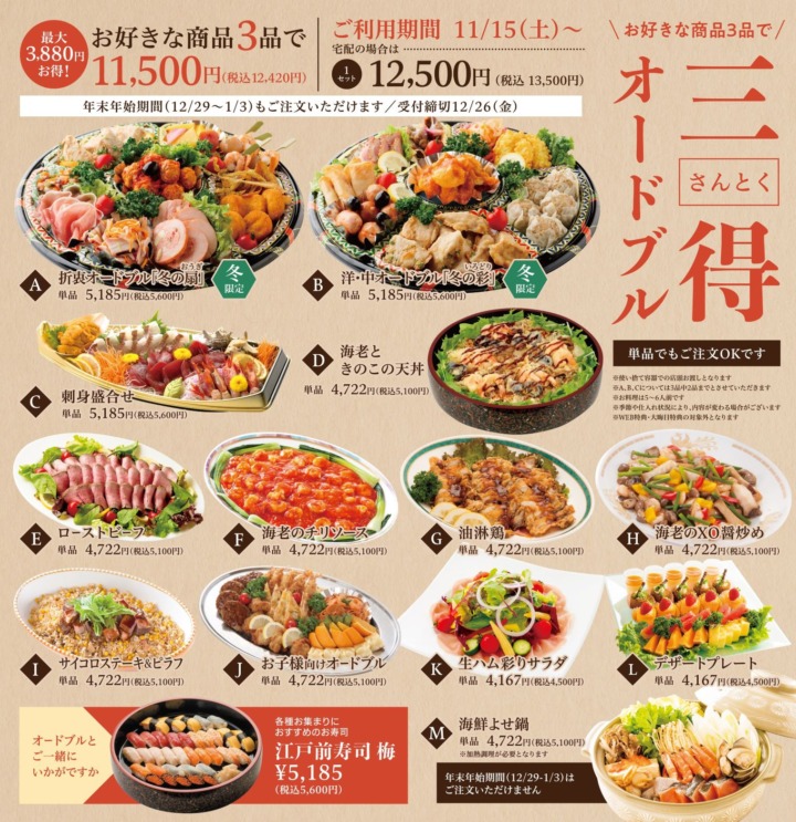 お好きな商品を3品選んで12,420円(税込)の三得オードブル!!